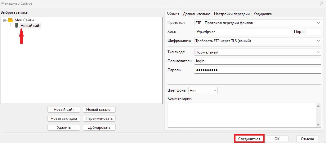 Теперь необходимо указать имя подключения (любое удобное для вас), в нашем примере это «Новый сайт». В правой части необходимо задать реквизиты для доступа к серверу. Реквизиты для виртуального хостинга были высланы вам на e-mail при создании аккаунта.
